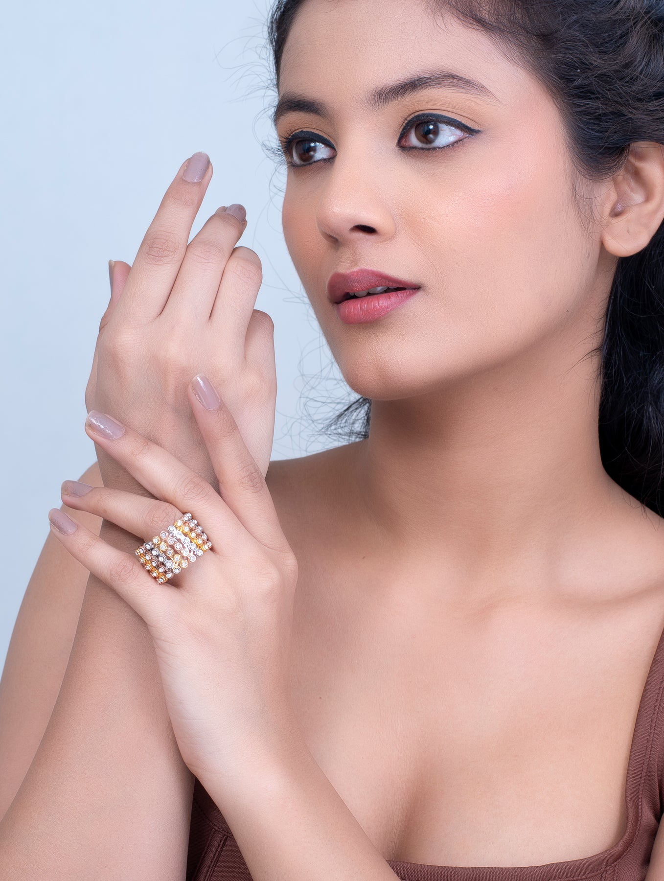 This stunning dual-tone ring cum bracelet is the perfect blend of sophistication and versatility. Whether worn as a statement ring or a delicate bracelet, it adds a touch of charm to any outfit. A must-have for those who love timeless beauty with a modern twist.
